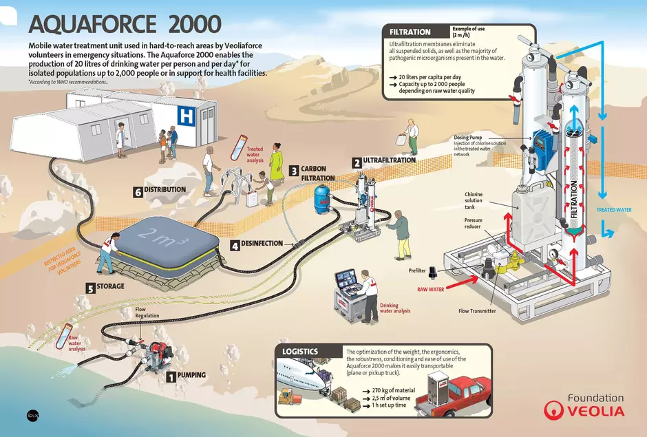 These units, Aquaforces 2,000, can treat up to 40,000 litres of water a day. Six 10 m3 flexible water storage tanks are also on their way to be handed over to the NGO Solidarités International, which is operating on the ground.