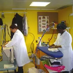 For the last 15 years, the Saddaka association has been developing a network of activities in Aulnay-sous-Bois: sports center, hairdressing salon, driving school, building finishing operations, catering service, café (no alcohol) and, since 1995, a laundry which accounts for 14% of its total income. Assisted by some 20 volunteers, the association employs 30 persons. The washing and ironing activity has permitted the creation of five reintegration jobs accompanied by a staff teacher. In 12 years, the laundry has become professional: on the 60 m2 of floor space, three large capacity washing machines and a drier-ironing machine have been installed. The next step? To buy a utility vehicle for collection and deliveries to serve new customers.