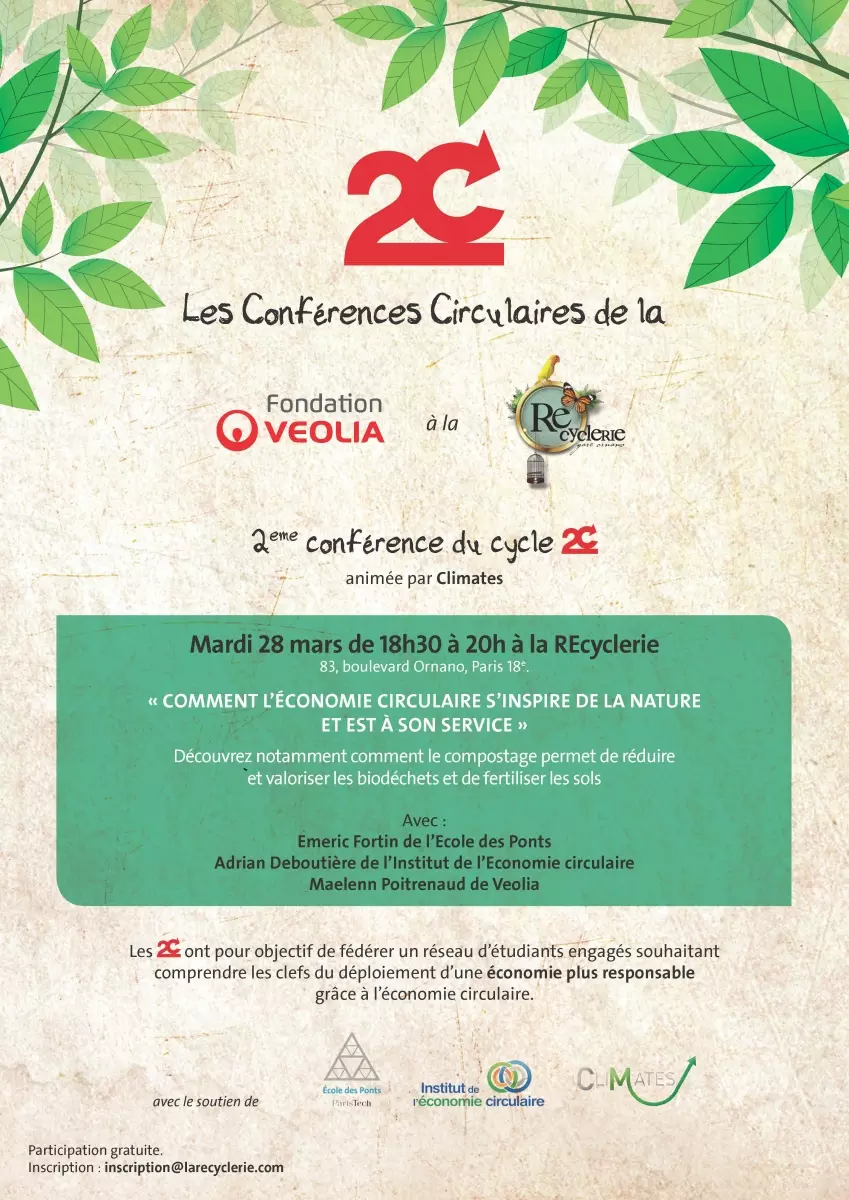 Comment l’économie circulaire s’inspire de la nature ? Comment se met-elle à son service ? Le sujet sera traité le 28 mars par Emeric Fortin de l’Ecole des Ponts, Adrian Deboutière de l’Institut de l’Economie circulaire, et Maelenn Poitrenaud de Veolia.