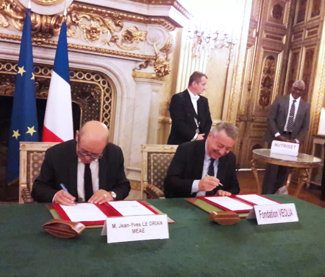 Le 19 décembre, le ministère de l’Europe et des Affaires étrangères (MEAE) a accueilli les représentants de douze fondations et associations œuvrant dans le secteur de l’aide humanitaire. La fondation Veolia, représentée par son président Antoine Frérot, était présente pour le renouvellement de la convention de partenariat signée en 2014. L’accord, cosigné par Antoine Frérot, également pdg de Veolia, et Jean-Yves Le Drian, ministre de l’Europe et des Affaires étrangères, porte sur les opérations humanitaires menées par le Centre de crise et de soutien du MEAE pour coordonner les interventions de chaque partie.