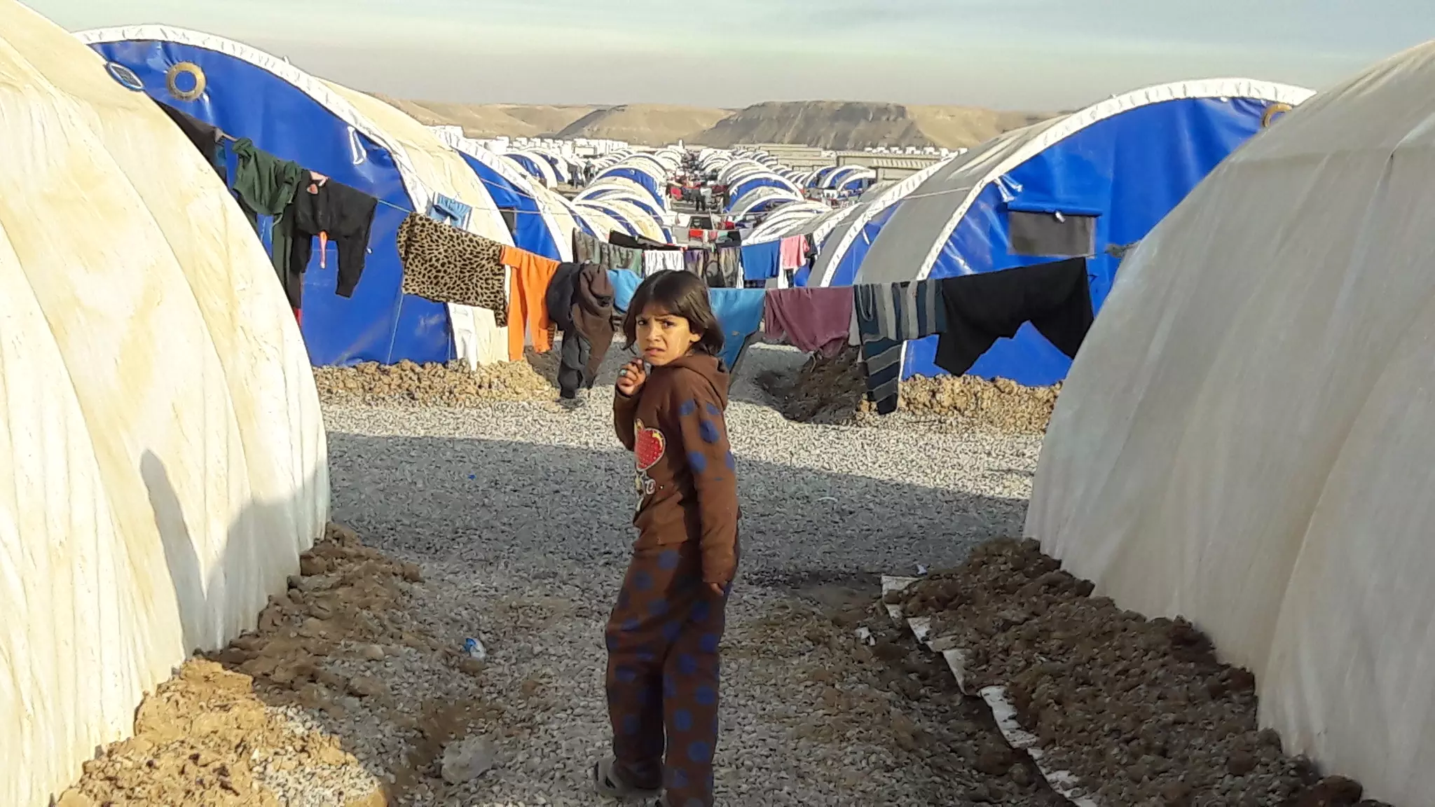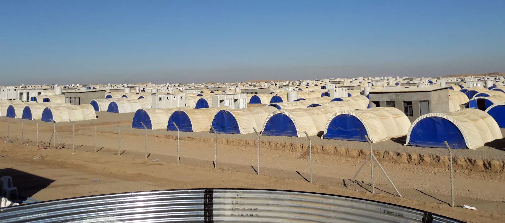 Depuis plusieurs semaines, les volontaires de Veoliaforce prêtent main-forte à la Croix-Rouge pour assurer l’alimentation en eau potable de camps de réfugiés situés à Hasansham, dont le nouveau camp de Khazer 2. L’équipe a installé une station M40, afin de de traiter l’eau de la rivière qui borde le camp. Celle-ci permet de purifier 200 m3/j d’eau brute par coagulation-floculation, puis décantation et désinfection au chlore. A terme, la capacité de production atteindra 300 m3/j. Une fois traitée, l'eau est stockée dans deux réservoirs de 95 m3 puis acheminée par des camions-citernes qui alimentent quotidiennement des petits réservoirs répartis dans tout le camp avec des rampes de robinets.