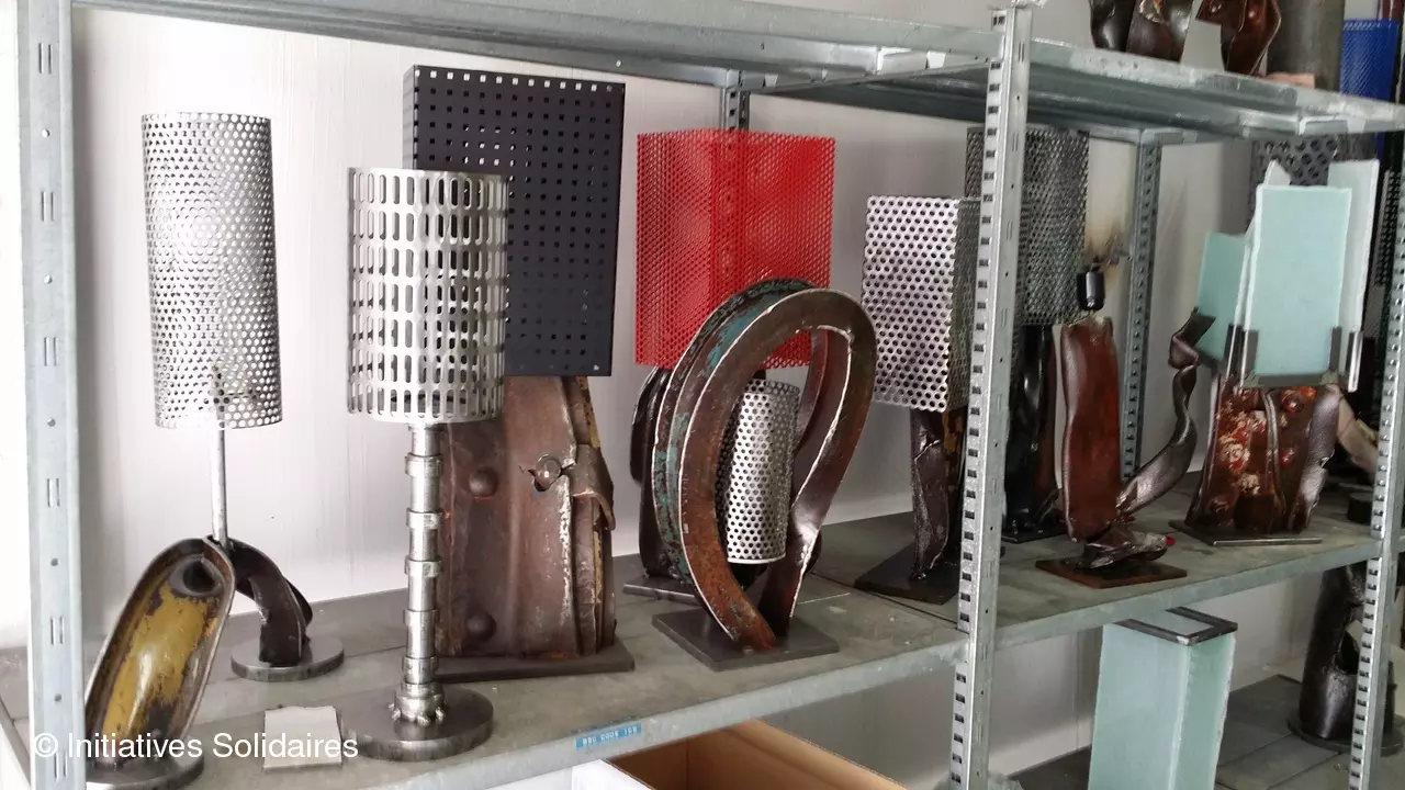 Ils sont une quinzaine, dans les anciens entrepôts de Cofely, à Aubervilliers, à être encadrés par Initiatives solidaires. Cette association, soutenue par la fondation Veolia et tournée vers la formation des personnes en réinsertion aux métiers du réemploi et de la récupération, a déjà produit plus de 500 objets. Avec Christian Grisinger, artiste issu de l’école Boulle, ils redonnent une seconde vie à toutes sortes de matériaux de récupération – métal*, bois, verre – en les transformant en meubles ou lampes design… Les productions sont ensuite vendues sur place lors d’expositions et l’argent récolté permet de rémunérer les travailleurs de l’atelier.