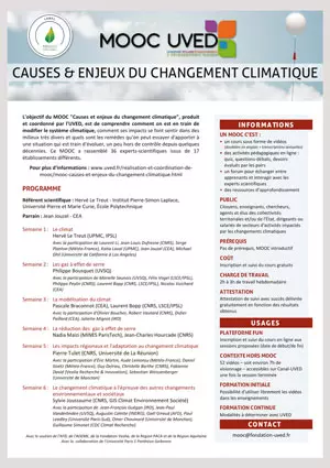 Grâce à ses nombreux partenaires, l’Université virtuelle Environnement & Développement durable (Uved) propose régulièrement au grand public des ressources pédagogiques thématiques. Fin 2015, pendant que la COP21 mobilisait des représentants internationaux, l’Uved a proposé au grand public un Mooc sur les “Causes et enjeux du changement climatique”. Pendant six semaines, des vidéos, des quiz et un forum interactif ont permis de tracer un tableau général des problèmes liés au changement climatique. Six thématiques ont été abordées par 36 intervenants issus de 17 établissements. Les 52 vidéos proposées représentaient sept heures de cours audiovisuels, relayés par des transcriptions textuelles.