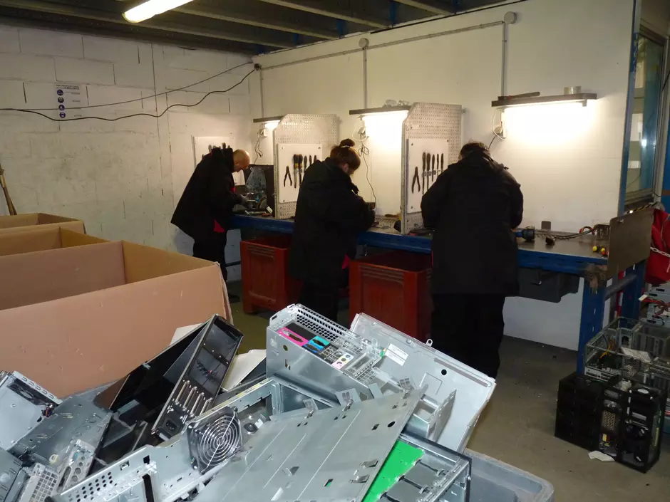L'atelier informatique est agrandi et organisé en cinq secteurs. Le démantèlement des écrans cathodiques est abandonné, l'atelier sport se spécialise sur les vélos, les zones de stockage sont optimisées et installées sur une mezzanine. Un préau extérieur couvert est aménagé en zone de stockage. Un bureau de l'encadrant technique informatique de 25 m² environ est créé au centre de l'atelier et peut servir également de petite salle de formation. L'acquisition d'une presse à balles permet de diviser par dix le volume des déchets générés par le démantèlement ; celle de 10 chariots roll rack de transporter les écrans plats, fragiles, qui doivent être traités avec délicatesse pour les revaloriser. Enfin, pour des questions de sécurité, d'efficacité et de formation des salariés en insertion, il est nécessaire d'installer sur les camions de collecte un système de hayon.