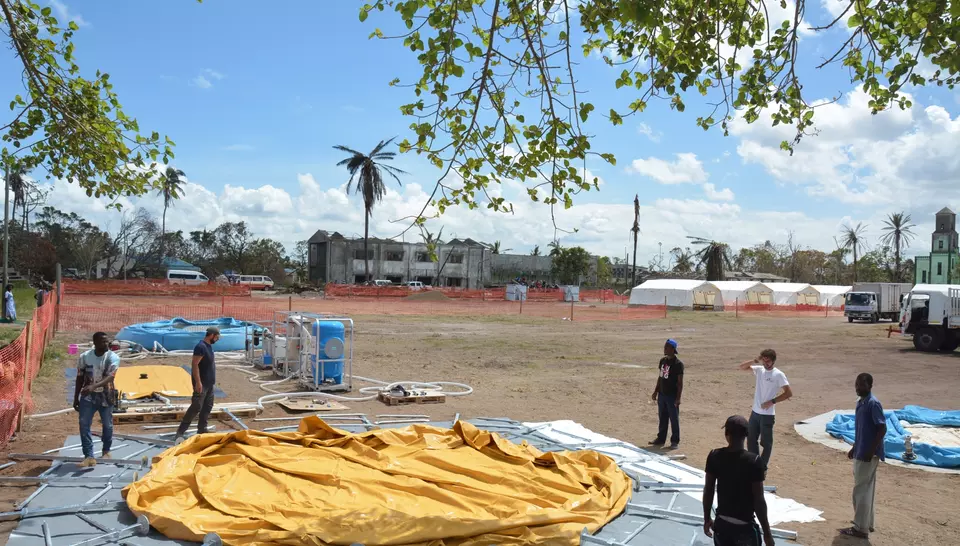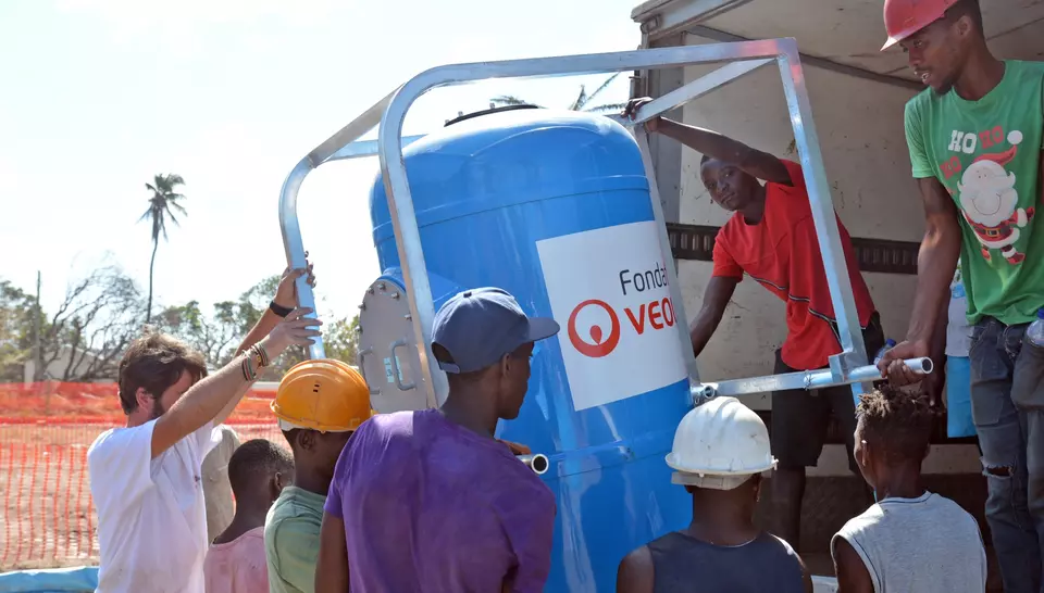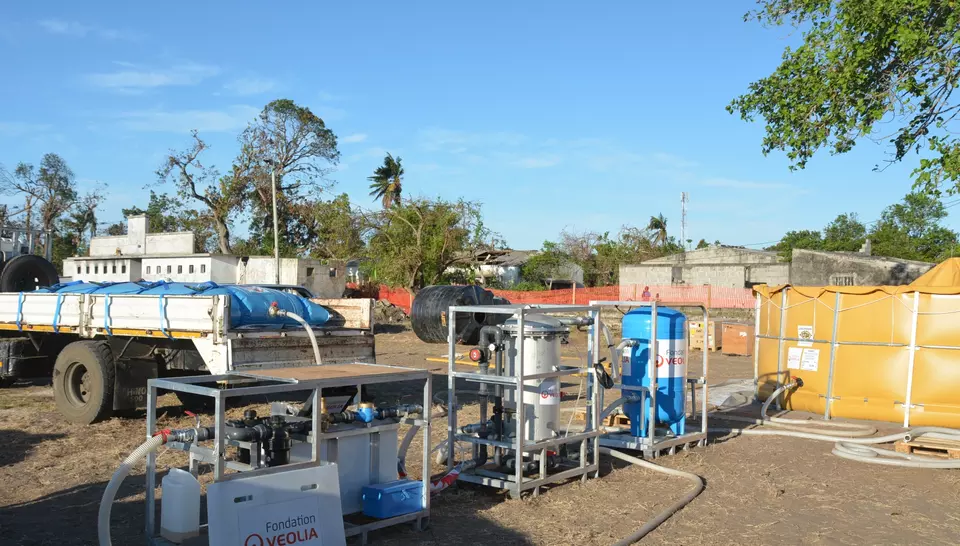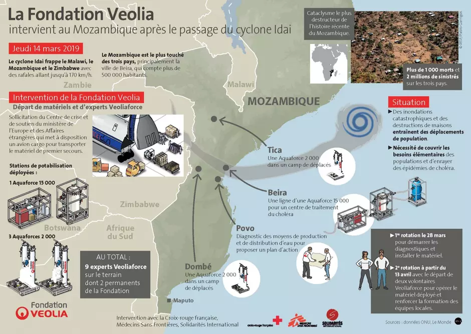 Des acteurs humanitaires, nombreux, convergent vers Beira qui devient le lieu de coordination de l'aide humanitaire. Médecins Sans Frontière et Solidarités International, deux partenaires de la fondation Veolia, sont présents dès les premiers jours. Ils vont accueillir une dizaine d'experts Veoliaforce missionnés pour déployer des Aquaforces, les unités mobiles de potabilisation de l'eau conçues par la fondation Veolia. Ces équipements sont installés au plus près de la population et dans les centres de santé ouverts peu après la catastrophe. L'enjeu est majeur : il faut accueillir et hydrater les malades du choléra qui commencent à affluer.