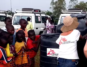 Formation de personnels Médecins Sans Frontières et déploiement d'une Aquaforce 500, unité de traitement mobile de l'eau, pour assurer l'alimentation en eau d'un Centre de santé itinérant géré par l'ONG.